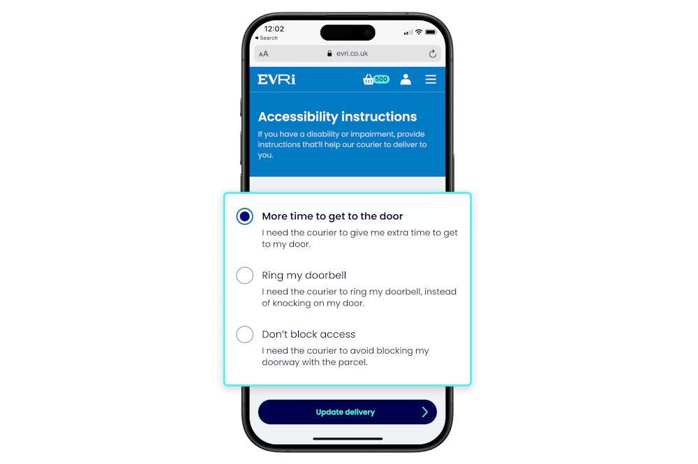 Select 'Accessibility instructions' and choose one of three options; give me more time to get to the door, ring my doorbell instead of knocking or don’t block my doorway with a parcel.