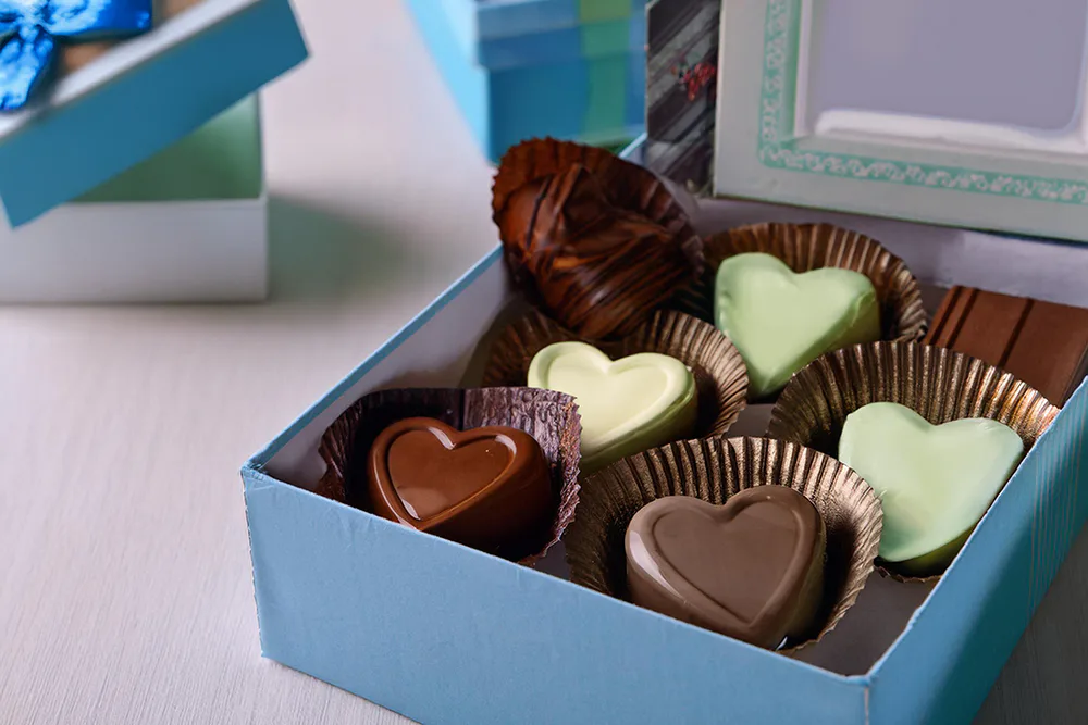Heart-shaped boxes, artisan chocolates, and indulgent gift baskets are always a hit.